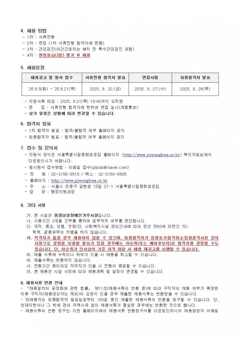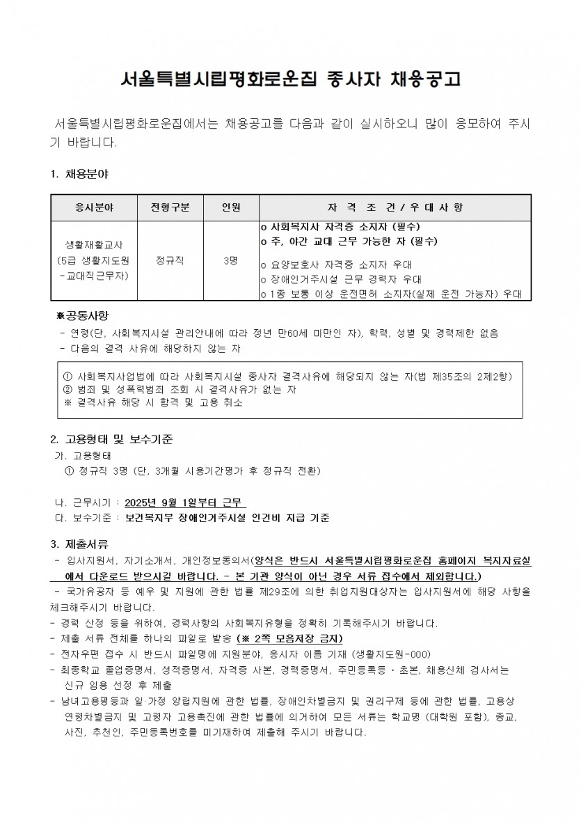시립평화로운집 제6차 신입직원 채용공고(생활지도원) 페이지 정보 작성자 한동주 작성일 25-08-05 16:09 조회 7,699회 댓글 0건 첨부파일 파일 시립평화로운집 입사지원서이력서,자기소개서및개인정보동의서.hwp (54.0K) 106회 다운로드 DATE : 2025-08-05 16:10:16 파일 2025년 6차 생활지도원채용공고.pdf (68.3K) 100회 다운로드 DATE : 2025-08-05 16:10:16 본문 이전글 다음글 목록 답변