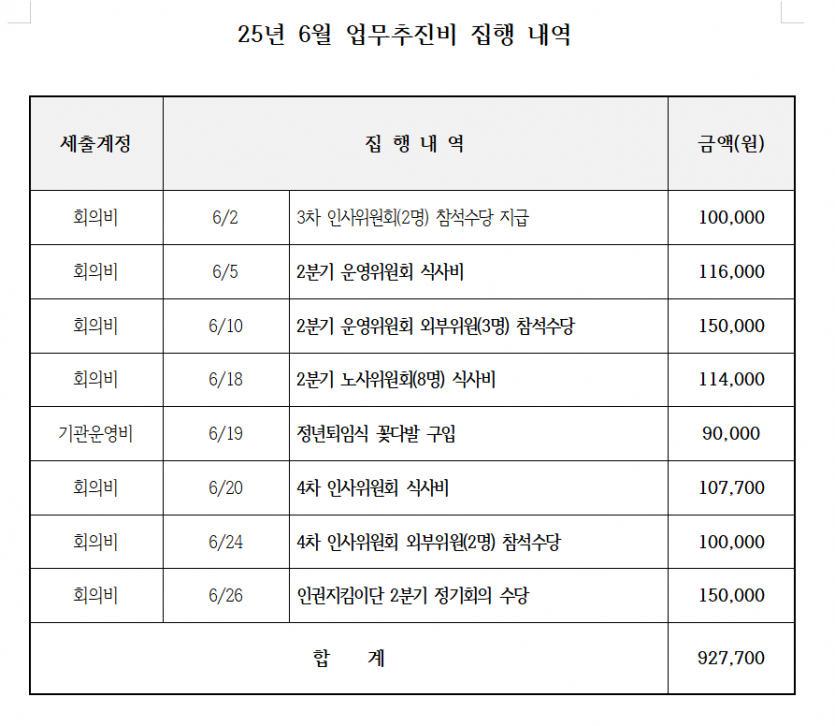 6월 업무추진비 내역공고 페이지 정보 작성자 한동주 작성일 25-07-04 17:35 조회 8,743회 댓글 0건 본문 6월 업무추진비를 다음과 같이 공고합니다. 이전글 다음글 목록 답변