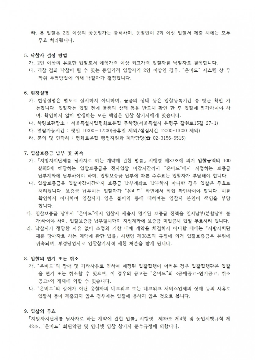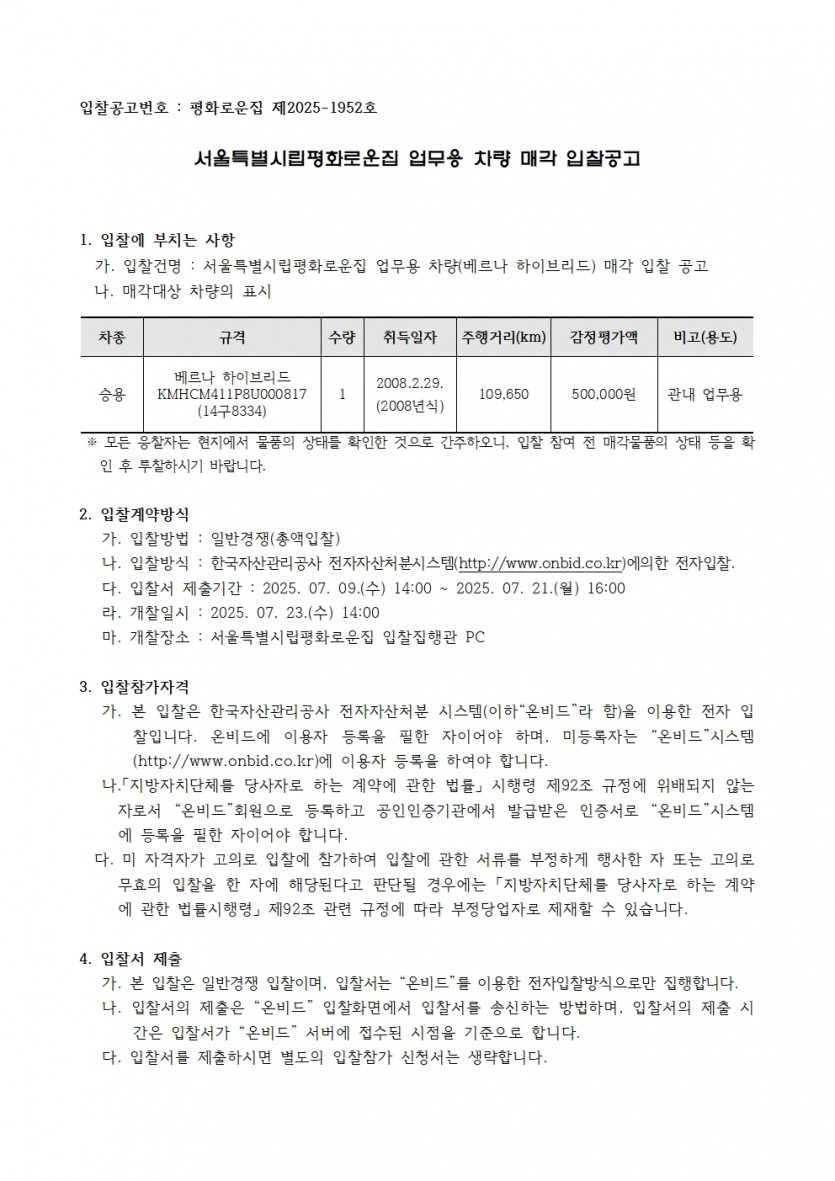 업무용 차량 매각 한국자산관리공사 전자자산처분시스템(온비드) 입찰공고 페이지 정보 작성자 한동주 작성일 25-07-09 11:45 조회 8,537회 댓글 0건 첨부파일 파일 입찰공고서_온비드_차량매각_공고문.hwp (70.5K) 91회 다운로드 DATE : 2025-07-09 11:45:50 본문 이전글 다음글 목록 답변