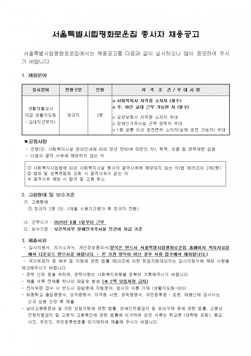 평화로운집 2025년 3차 종사자(생활지도원) 채용 공고 페이지 정보 작성자 한동주 작성일 25-05-02 14:08 조회 11,079회 댓글 0건 첨부파일 파일 2025년-생활지도원 3차.hwp (114.5K) 97회 다운로드 DATE : 2025-05-02 14:08:29 파일 시립평화로운집 입사지원서이력서,자기소개서및개인정보동의서.hwp (54.0K) 149회 다운로드 DATE : 2025-05-02 14:08:29 본문 평화로운집 2025년 3차 종사자(생활지도원) 채용을 다음과 같이 공고합니다. 이전글 다음글 목록 답변