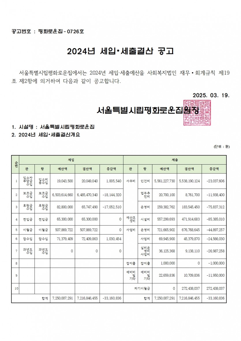 2024년 세입세출 결산서 공고 페이지 정보 작성자 한동주 작성일 25-03-19 13:28 조회 12,520회 댓글 0건 첨부파일 파일 홈페이지2024 세입.세출견결산공고.pdf (48.3K) 138회 다운로드 DATE : 2025-03-19 13:28:29 본문 2024년 세입세출결산서를 다음과 같이 공고합니다. 이전글 다음글 목록 답변