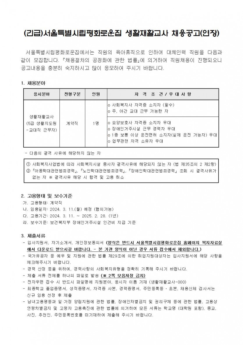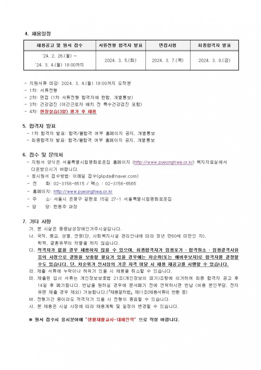 (긴급)서울특별시립평화로운집 생활재활교사 채용공고(연장) 페이지 정보 작성자 한동주 작성일 24-02-26 14:43 조회 20,174회 댓글 0건 첨부파일 파일 시립평화로운집 입사지원서이력서,자기소개서및개인정보동의서.hwp (22.5K) 143회 다운로드 DATE : 2024-02-26 14:43:58 본문 이전글 다음글 목록 답변