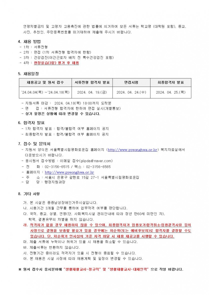 2024년 4차 직원채용(생활지도원) 모집공고 페이지 정보 작성자 한동주 작성일 24-04-04 17:29 조회 19,136회 댓글 0건 첨부파일 파일 시립평화로운집 입사지원서이력서,자기소개서및개인정보동의서.hwp (22.5K) 175회 다운로드 DATE : 2024-04-04 17:29:21 본문 장애인거주시설 주52시간 근무제 시행에 따라 정규직으로 근무할 생활재활교사(생활지도원) 채용 모집 공고를 실시하고자 합니다. 이전글 다음글 목록 답변