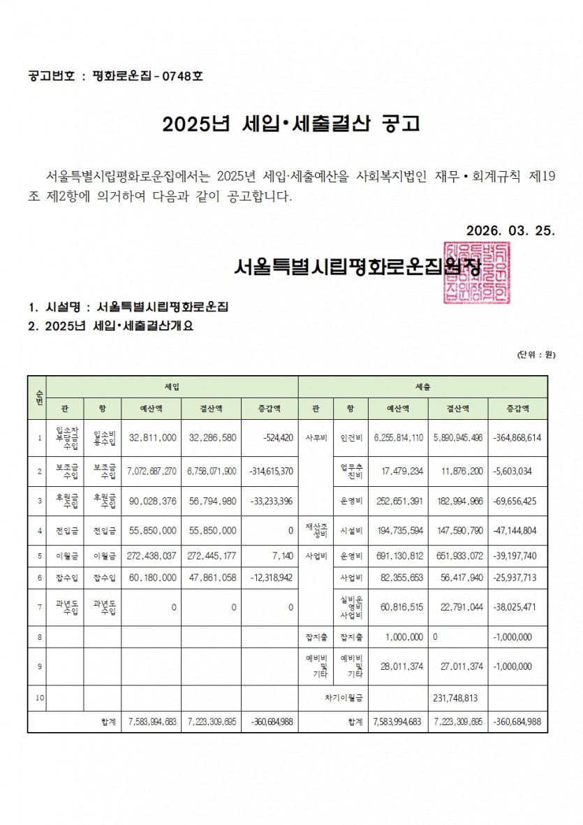 2025년 세입 세출 결산서 공고 페이지 정보 작성자 한동주 작성일 26-03-25 16:42 조회 112회 댓글 0건 첨부파일 파일 홈페이지 세입.세출견결산공고.pdf (58.6K) 4회 다운로드 DATE : 2026-03-25 16:42:12 본문 2025년 세입세출 결산서를 붙임과 같이 공고합니다. 이전글 다음글 목록 답변