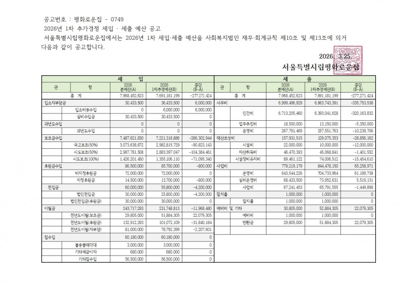 2026년 1차 추가경정 예산 공고 페이지 정보 작성자 한동주 작성일 26-03-25 16:51 조회 130회 댓글 0건 첨부파일 파일 홈페이지공고 .pdf (75.1K) 4회 다운로드 DATE : 2026-03-25 16:51:20 본문 이전글 다음글 목록 답변