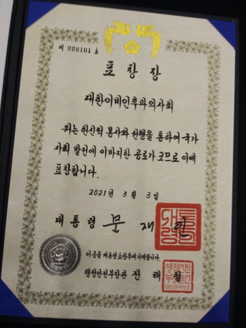 후원자·봉사자 이야기 | 대한이비인후과 의사회 대한민국 국민포상 대통령표창 수상 페이지 정보 작성자 한동주 작성일 21-03-19 09:55 조회 12,275회 댓글 1건 본문 평화로운집 개원이후 지속적으로 의료봉사활동을 하고 계시는 대한이비인후과의사회에서 올해 3월3일 대한민국 국민포상 대통령표창을 수상하였습니다. 오랜기간 본원의 장애인들을 위해 봉사해주신 대한이비인후과의사회 여러분들께 진심으로 감사와 축하말씀드립니다. 댓글목록 박성호님의 댓글 박성호 작성일 21-03-19 13:08 축하드립니다! 축하드립니다! 이전글 다음글 목록