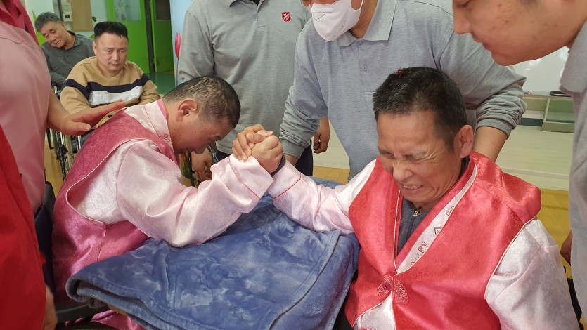 3개의 생활관에서 생활하시고 계신 가족들이 모여 팔씨름, 각 생활실 별 윷놀이 예선전이 진행되었는데