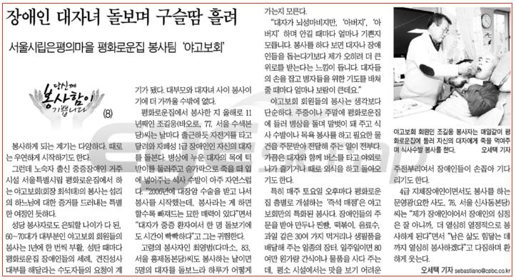 평화로운집에서 봉사한 지 올해로 11년째인 조길웅(바오로, 77, 서울 수색본당)씨는 날마다 출근하듯 자전거를 타고 달려와 자폐성 1급 장애인인 자신의 대자를 돌본다. 병상에 누운 대자의 목에 턱받이를 둘러주고 숟가락으로 죽을 떠 입에 넣어주는 식사 수발이 아주 자연스럽다. “2006년에 대장암 수술을 받고 나서 봉사를 시작했는데, 봉사라는 게 하면 할수록 빠져드는 묘한 매력이 있다”면서 “대자가 중증 환자여서 한 명 돌보기에도 시간이 빡빡하다”고 그는 귀띔한다.