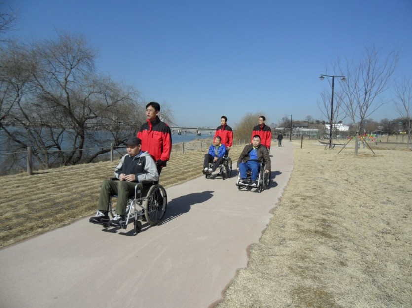 휠체어가 다닐 수 있는 경사로로 내려가서 넓은 잔디와 바람개비가 휘날리는