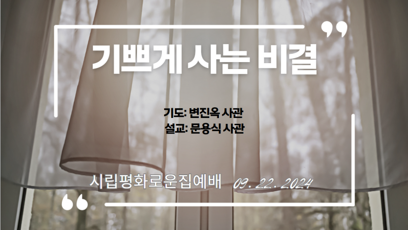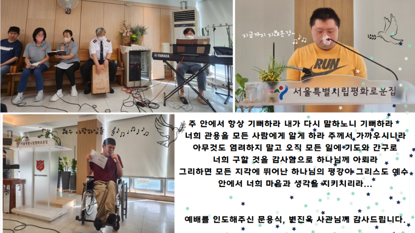 거주인 이야기 | 09.22. 주일 성결 예배 페이지 정보 작성자 장설궁 작성일 24-09-22 15:16 조회 7,237회 댓글 0건 본문 "주 안에서 항상 기뻐하라 내가 다시 말하노니 기뻐하라"기쁘게 사는 비결 정직함을 잃어버리지 마시고, 지난 과오는 잊어버리시고 하나님은 우리의 지난 과오는 기억하지 않으시니..문용식 사관님께서 전해주신 말씀처럼 스스로 자기 삶에 만족하고항상 기뻐하시기를 바라겠습니다~예배를 인도해주신 문용식, 변진옥 사관님 감사합니다. 이전글 다음글 목록