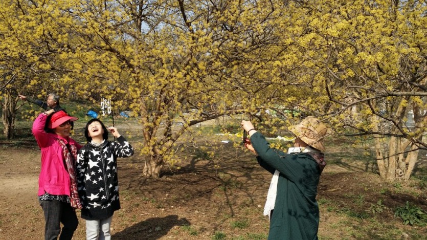활짝핀 산수유 나무 아래에서 폼을 잡고 추억 남기기에 여념이 없었다