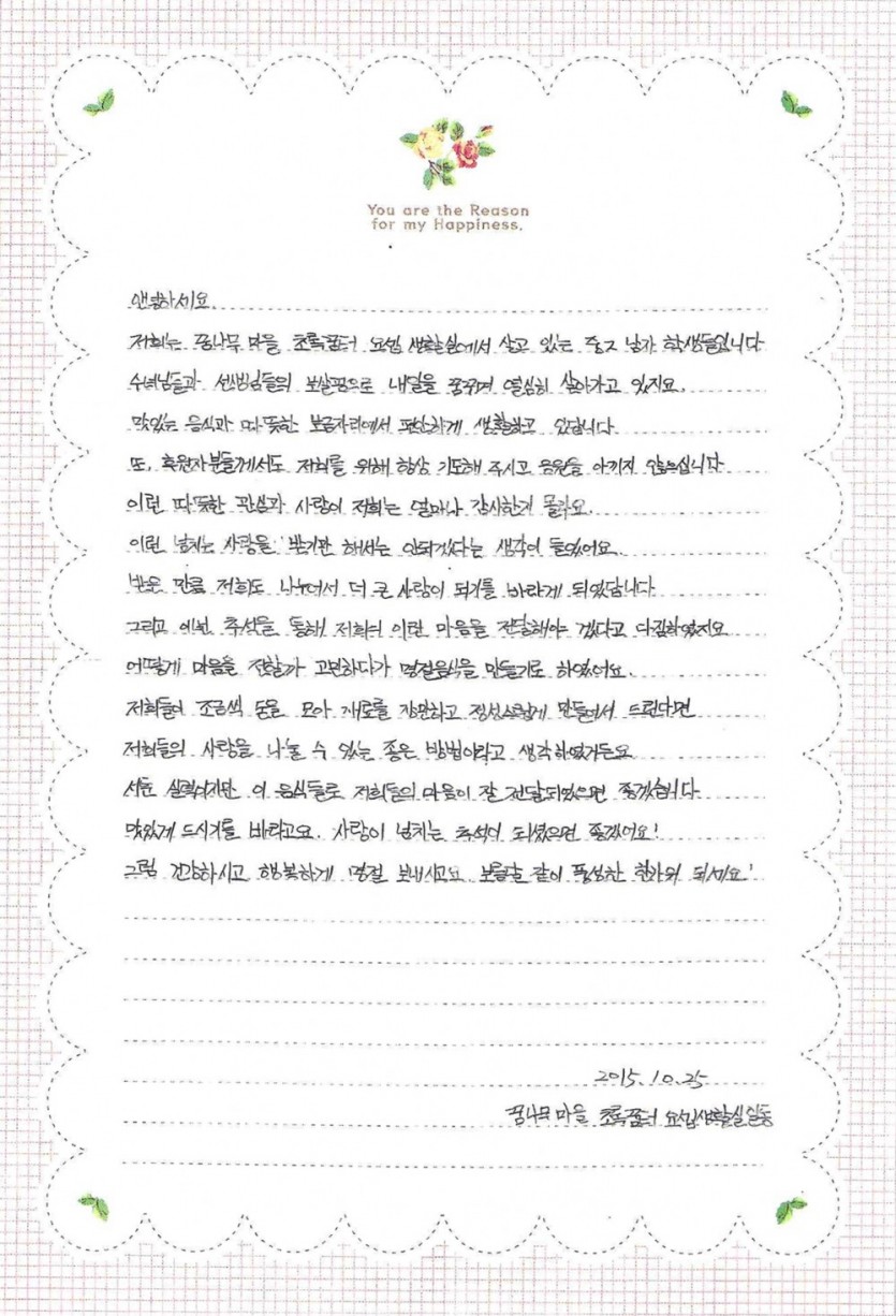 꿈나무마을에서 날아온 따뜻한 편지한장 페이지 정보 작성자 이상목 작성일 15-11-02 15:10 조회 9,509회 댓글 0건 첨부파일 본문 2015년 추석을 앞두고...저희 가족분들이 후원을 하는 꿈나무마을 학생들에게 한통의 감사편지가 들어왔습니다.아무리 장애를 가지고 있다해도 마음만큼은 늘 따뜻하고 정이 많으신 우리 가족 여러분들.고맙습니다~~우리 가족분들의 따뜻함을 여러분들과 함께 나누고 싶습니다. 이전글 다음글 목록