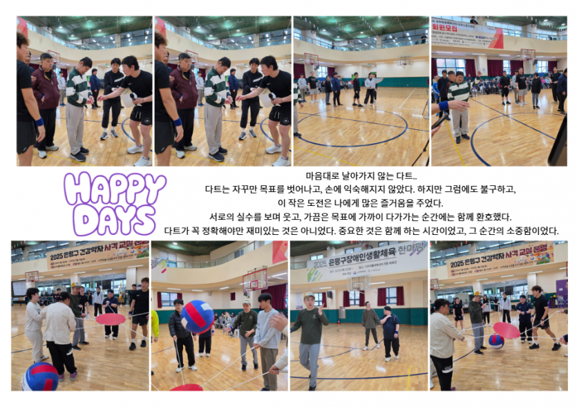 거주인 이야기 | 은평구 생활체육 한마음 페이지 정보 작성자 장설궁 작성일 25-10-27 10:12 조회 2,133회 댓글 0건 본문 은평구 생활체육 한마당에 다녀왔습니다. 여러 친구들과 함께한 시간은 즐거웠습니다.서로의 실력을 겨루기도 하고 응원하며 웃어보기도 하고이런 행사는 지역 사회의 유대감과 건강한 생활을 장려하는 데큰 도움이 되는 것 같습니다. 다음엔 꼭 이길게..라는 한 마디에 내년을 기약해 봅니다. 이전글 다음글 검색 목록