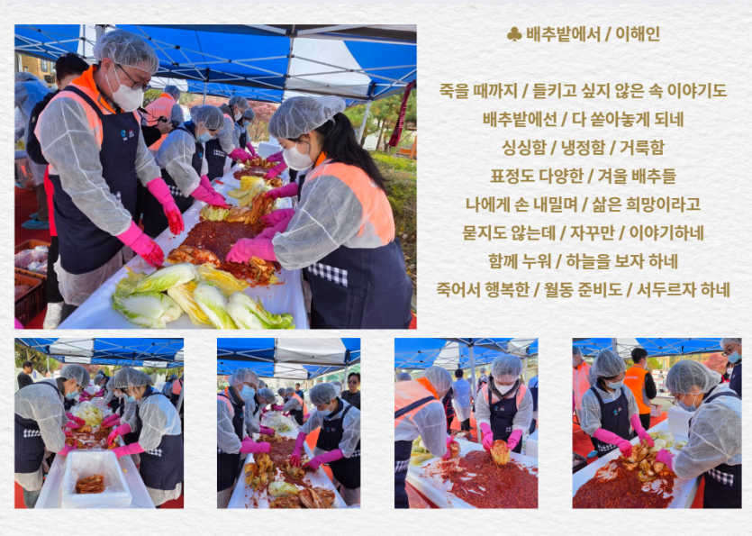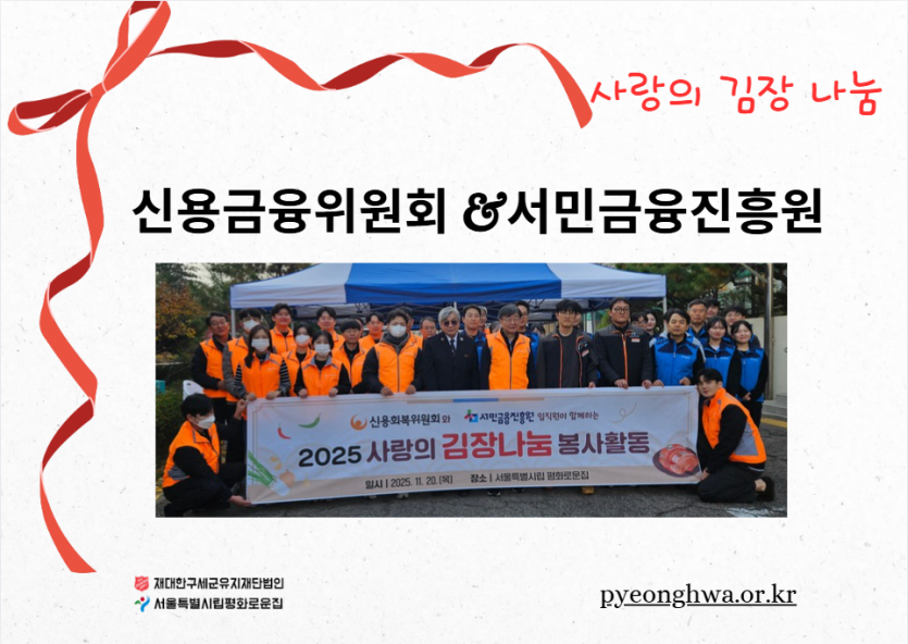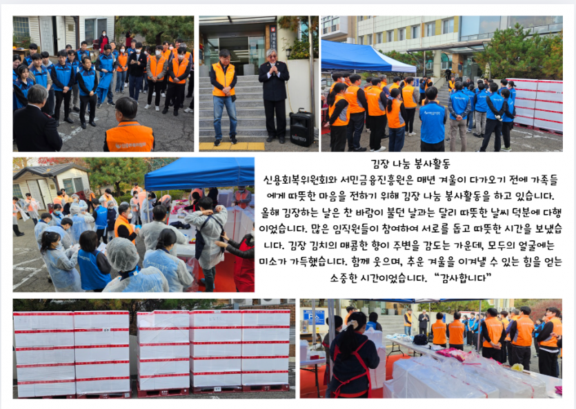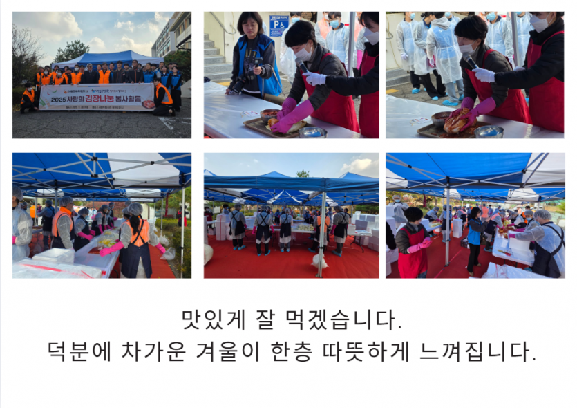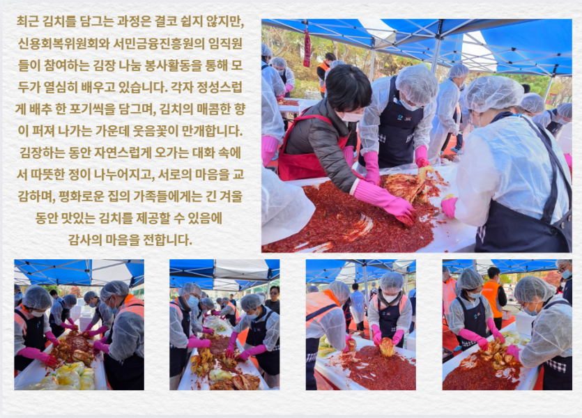 후원자·봉사자 이야기 | 신용회복위원회와 서민금융진흥원과 함께 하는 김장 페이지 정보 작성자 장설궁 작성일 25-11-26 11:16 조회 1,719회 댓글 0건 본문 신용회복위원회와 서민금융진흥원과 함께한 김장임직원분들께서 직접 김치를 담으며 가족분들이 겨울에 맛있게 드신다는 생각에 한 포기 한 포기 정성을 담아따뜻한 마음을 전해주셨습니다. 이 김치가 식탁에 오를 때마다 사랑이 깃든 이 따스함을잊지 않겠습니다. 함께해 주신 모든 분들께 다시 한 번 깊은 감사를 드립니다.고맙습니다.감사합니다. 이전글 다음글 목록