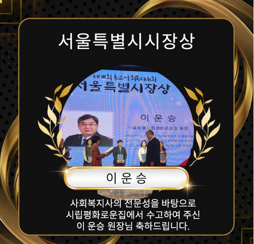 제18회 종교사회복지대회 서울특별시장상 페이지 정보 작성자 장설궁 작성일 24-01-10 11:51 조회 6,185회 댓글 0건 본문 지난 12월 27일 오후 4시 30분 서울 마포구 케이터틀에서 ‘제18회 종교사회복지대회’를 개최했습니다사회복지의 성장을 위해 헌신한 서울특별시립평화로운집 이운승 원장님께서 서울특별시시장상 수상하셨습니다. 축하드립니다. 이전글 다음글 목록