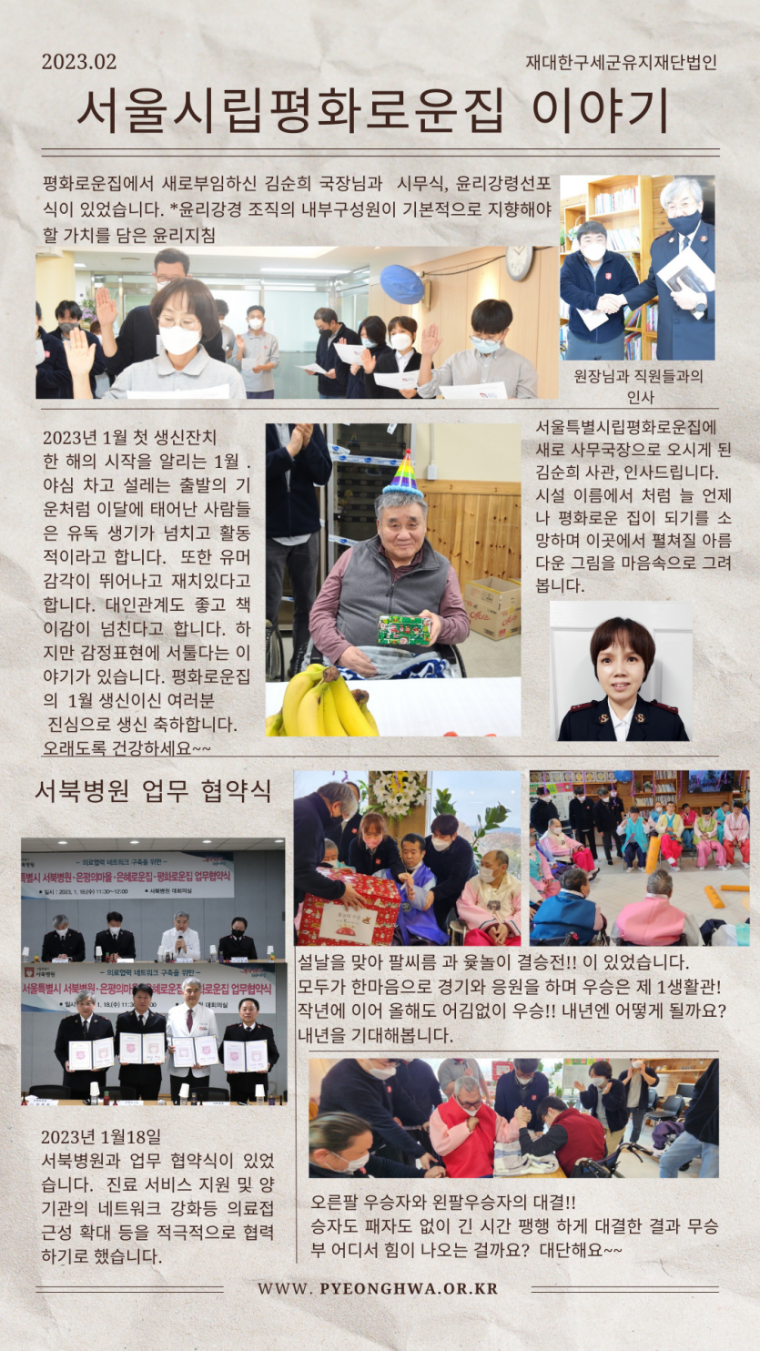 2023년 2월 후원감사편지 페이지 정보 작성자 장설궁 작성일 23-02-13 11:31 조회 10,864회 댓글 0건 본문 안녕하세요? 후원자님겨울 추위가 막바지에 다다른 2월 입니다. 아직 추위가 매섭지만 조금만 더 기다리면 봄이 온다는 생각에 기다림이 즐겁지 않으시나요?포근한 봄을 맞이하기 위해 건강 관리 잘 하시고 몸도 마음도 다가올 봄의 활력으로 가득 채워보시길 바라면서 ^^평화로운가족들의 이야기를 들려들입니다~~ 항상 행복 하세요♡ 이전글 다음글 목록
