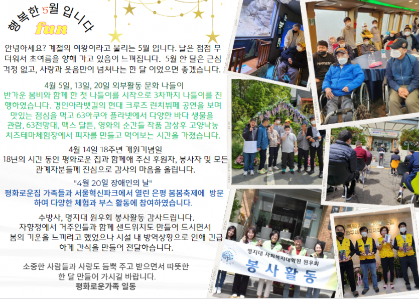 2023년 5월 후원감사편지 페이지 정보 작성자 장설궁 작성일 23-05-10 16:23 조회 10,012회 댓글 0건 본문 초록 세상 5월입니다.화사한 꽃과 함께 싱그러운 나뭇잎을 보며 마음의 평화와 기쁨을 느껴 보시길 바라며 평화로운 가족의 소식을 전해드립니다. 이전글 다음글 목록