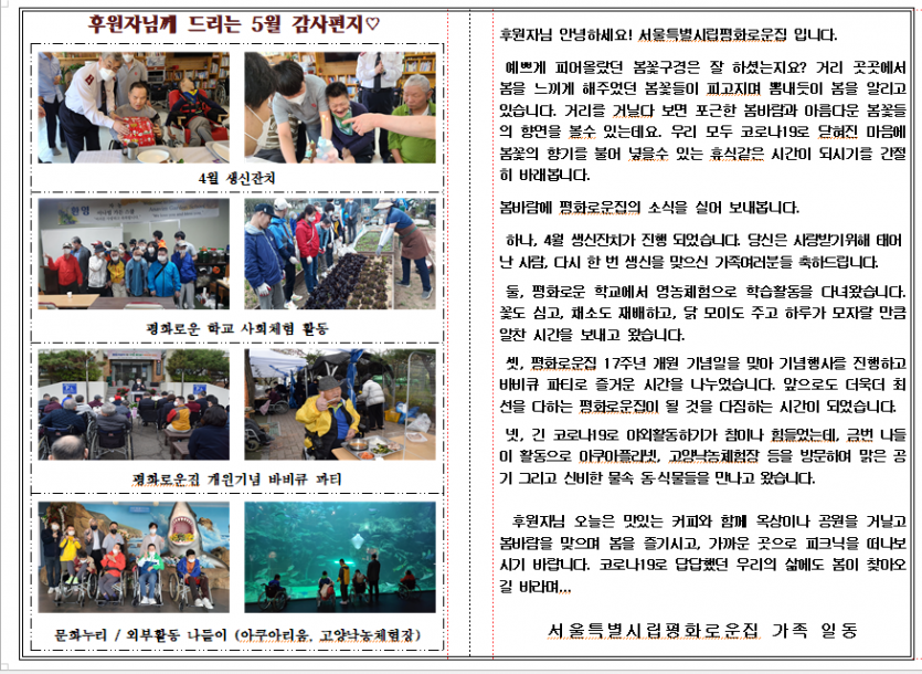 2022년 5월 후원자 감사편지 페이지 정보 작성자 장설궁 작성일 22-07-08 13:31 조회 12,085회 댓글 0건 본문 ♤ 봄향기가 향기로운 5월 이예요~~5월엔 5배로즐겁고 행복한 일들만 가득 하시길 바라며 저희 평화로운집 식구들의 소식을 전합니다.♤ 이전글 다음글 목록
