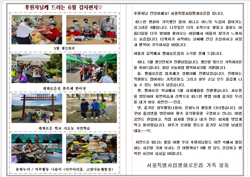 2022년6월 후원자 감사편지 페이지 정보 작성자 장설궁 작성일 22-07-13 18:03 조회 12,085회 댓글 0건 본문 "어느덧 한 해의 반인 6월이 다가왔습니다"특히, 6월은 호국보훈의 달이기도 하지요. 6월어느 하루 쯤은 오늘의 나라를 위해 희생한 많은 사람들을 위한 생각을 해보았으면 합니다. 덥고 습해지는 날씨에 건강에 유의하시고 항상 행복하시기 바라면서 평화로운집 가족들의 소식을 전해드립니다~~~ 충성 !! 이전글 다음글 목록