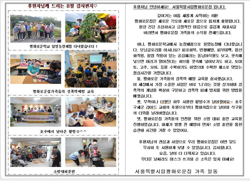 2022년 8월 후원자 감사편지 페이지 정보 작성자 장설궁 작성일 22-08-08 10:43 조회 11,908회 댓글 0건 본문 8월은 내가 나에게 휴식을 선물하는 의미 있는 달이였으면 좋겠습니다.새해를 열면서 다짐했던 것을 실천하고 있는 나에게 선물을 주는 8월!그 선물 속에는 가족과 친구가 있고 함께 지낸 사람들의 고마움도 담겨 있겠지요.시간은 빠르게 지나갑니다. 누구나 그러하듯이 또 다른 한 해를 향한 남은 시간도 더 빠르게 지나가겠지요 (●'◡'●)8월에 받은 선물이 가을과 겨울로 이어져서 행복이 될 수 있게 꿈이 담겼으면 좋겠습니다. 이전글 다음글 목록
