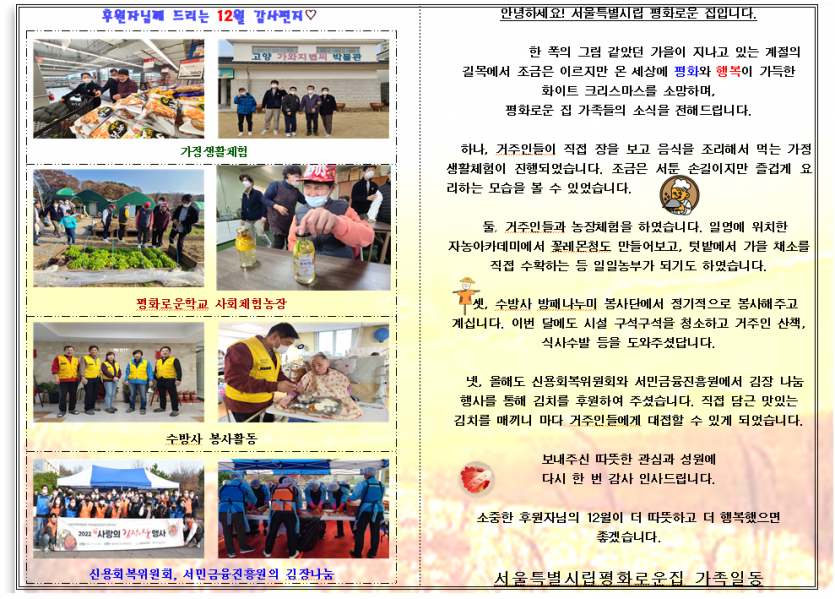 2022년 12월 후원감사편지 페이지 정보 작성자 장설궁 작성일 22-12-08 13:00 조회 10,898회 댓글 0건 본문 어느덧 2022년 한해를 마무리하는 마지막 달 12월이 되었습니다. 우리가 함께 해서 너무나 행복한 시간들 이었습니다.남은 시간을 아쉬워 하기보다는 채워가는 12월 보내시길 바랍니다. 소리 없이 세상을 하얗게 물들이는 하얀 눈처럼 조용히 찾아오는 일상에서 평온함이 가득하길 기원합니다. ♡ 이전글 다음글 목록