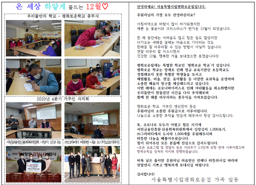 2020년 12월 후원자 감사편지 페이지 정보 작성자 박상은 작성일 21-01-21 13:38 조회 14,168회 댓글 0건 본문 2020년 12월, 크리스마스 캐롤 울려퍼지는 설레는 겨울에 늘 나눔으로 함께해주시는 후원자님께감사의 편지를 올립니다. 이전글 다음글 목록