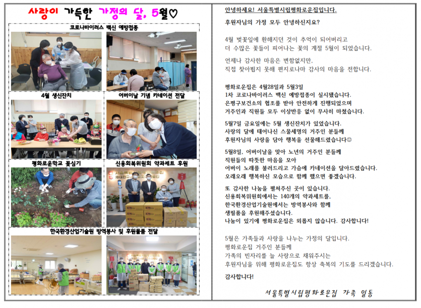 2021년 5월 후원자 감사편지 페이지 정보 작성자 박상은 작성일 21-05-17 17:55 조회 14,524회 댓글 0건 본문 5월은 꽃의 계절, 사랑의 계절..항상 사랑으로 함께 해주시는 후원자님의 나눔에 감사드립니다.늘 나눔으로 함께해주시는 후원자님께감사의 편지를 올립니다. 이전글 다음글 목록