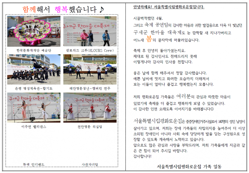 2019년 4월 연합축제 공연팀 감사편지 페이지 정보 작성자 박상은 작성일 20-09-11 11:50 조회 13,597회 댓글 0건 본문 첫 실시된 3개시설 연합축제에 귀한 발걸음 해주시고멋진 공연을 선물해주신 관계자 분들께감사의 편지를 올립니다. 이전글 다음글 목록