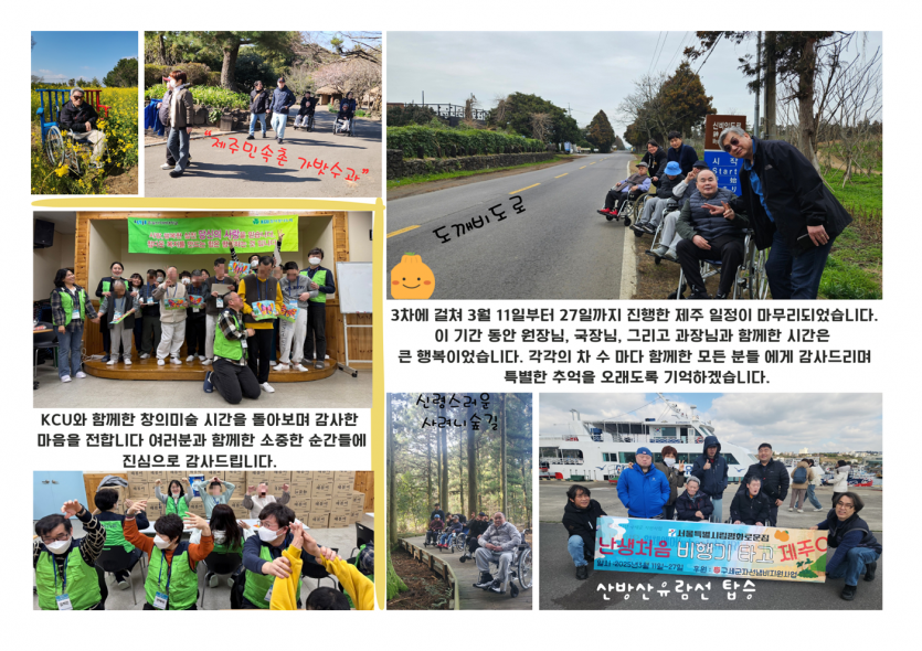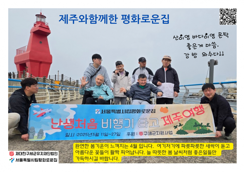 2025년 시립평화로운집 4월 후원 감사 편지 페이지 정보 작성자 장설궁 작성일 25-04-01 11:43 조회 4,460회 댓글 0건 본문 따뜻한 봄의 기운이 가득한 4월, 여러분의 사랑과 후원에 진심으로 감사드립니다.3월에 제주도에서 새로운 경험을 하였습니다. 다양한 문화와 아름다운 자연환경을 경험하며 새로운 영감을 얻는 시간이었습니다. 여러분의 관심과 사랑으로, 우리는 더 큰 꿈을 향해 나아갈 수 있습니다. 여러분의 지속적인 사랑과 후원에 감사드리며, 우리가 함께하는 이 여정에서 더 큰 성과를 이루기를 기대합니다.진심으로 감사드립니다. 이전글 다음글 목록