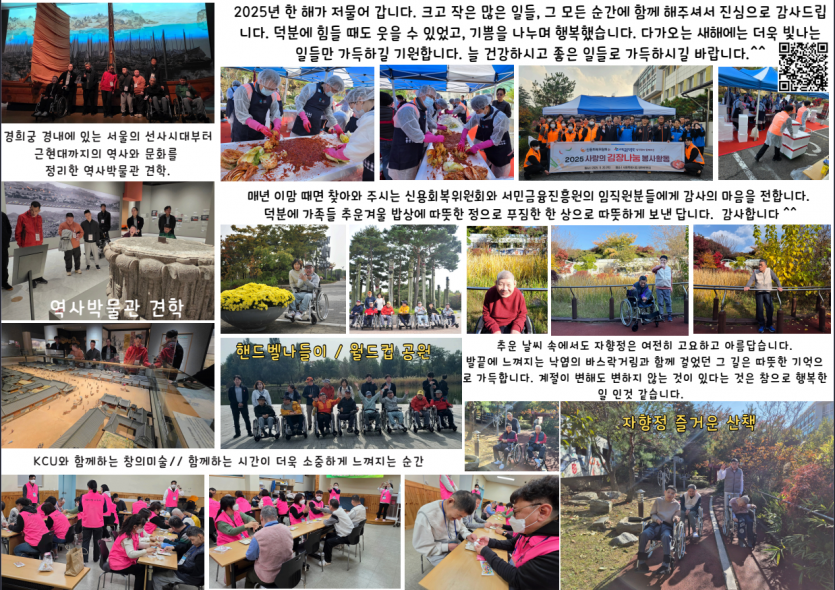 2025년 시립평화로운집 12월 후원감사편지 페이지 정보 작성자 장설궁 작성일 26-01-04 09:46 조회 913회 댓글 0건 본문 어느덧 마지막 달이 되었네요올해 저히에게 찾아온 소중한 인연에 깊이 감사드립니다.남은 한 달도 행복한 추억 많이 만드시길 바라며,다가오는 2026년에는 더욱 멋진 일들로 가득하시길 응원하겠습니다. 이전글 다음글 목록